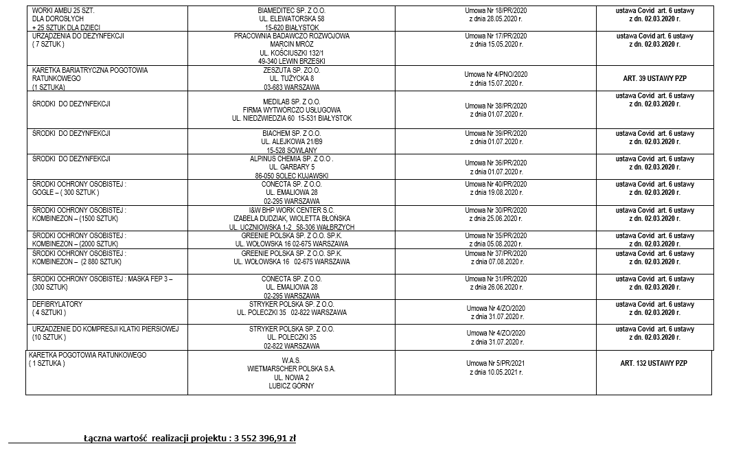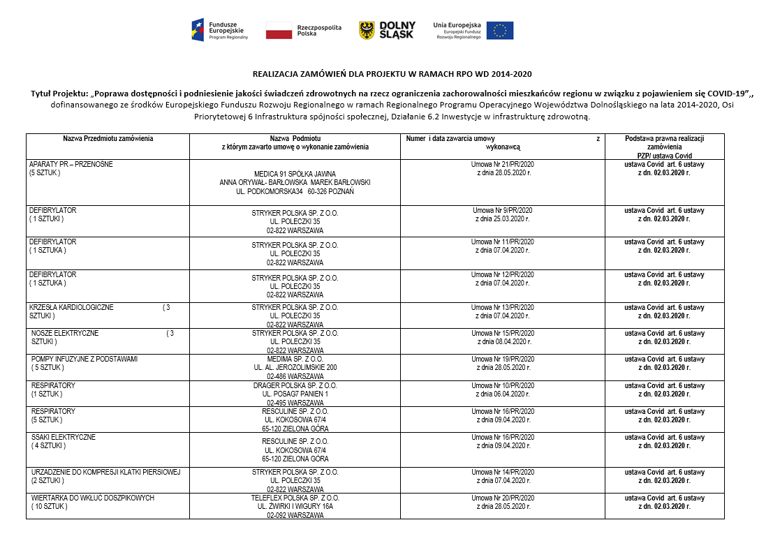 Tytuł projektu: „Poprawa dostępności i podniesienie jakości świadczeń zdrowotnych na rzecz ograniczenia zachorowalności mieszkańców regionu w związku z pojawieniem się COVID-19”.